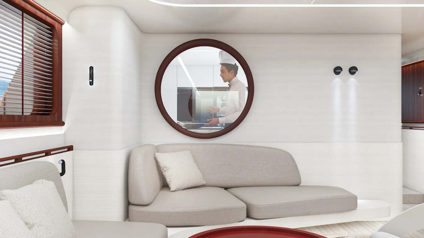 The vessel's layout has also been radically altered by architect Aldo Parisotto so that it can also function as a family cruise ship and accommodate more guests, both media and clients, for sea trial purposes. In addition, Parisotto+Formenton Architetti designed the evocative Arcipelago Capsule Collection of indoor and outdoor lighting for the installed Quick Marine Lighting brand.