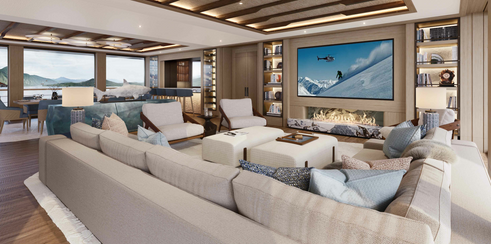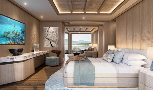 Στην κορυφή του γιοτ, το Owner’s Deck αντλεί έμπνευση από τη γαλήνια επιφάνεια του ωκεανού. Καθώς κατεβαίνετε μέσα από τα καταστρώματα, οι τόνοι και οι υφές αλλάζουν, αντικατοπτρίζοντας τα πιο σκούρα μπλε σε χρώμα βάθη του ωκεανού. Το Wellness Deck παραπέμπει σε πιο δροσερά, βαθύτερα νερά.