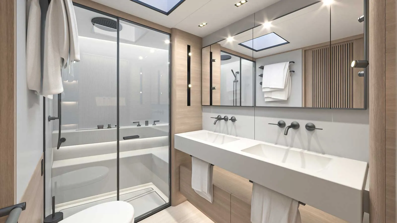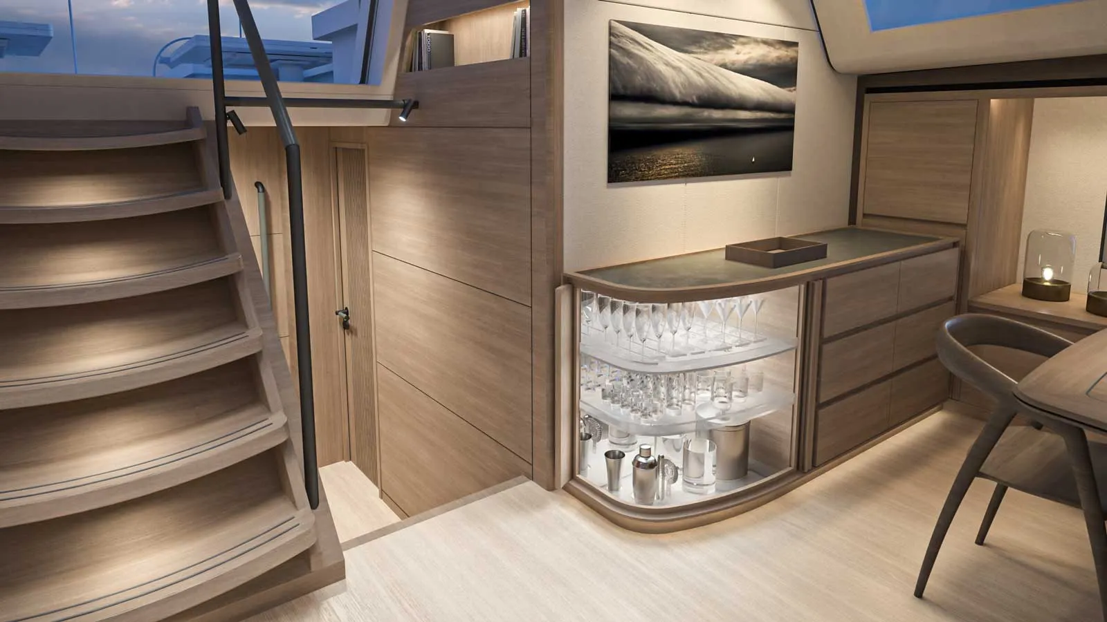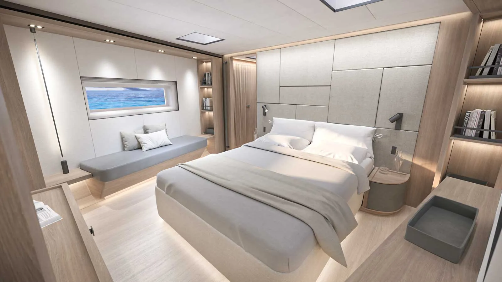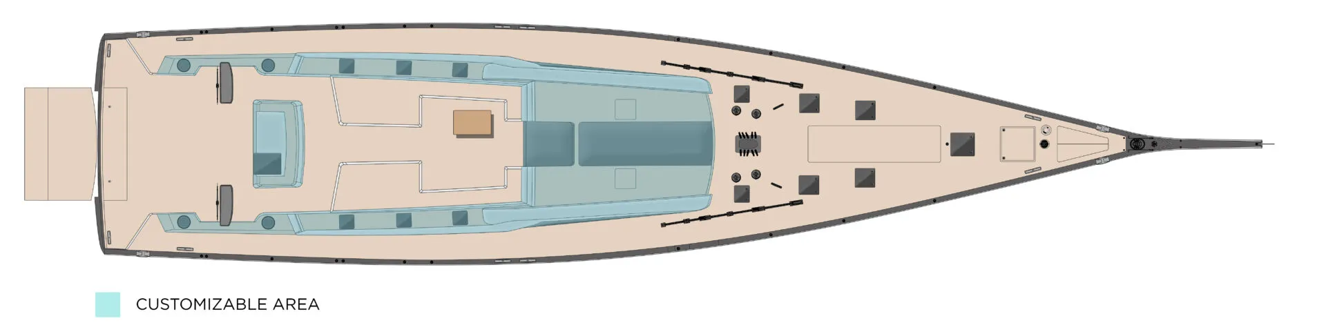Το γιοτ διαθέτει μια προσαρμόσιμη διάταξη με εύκολη πρόσβαση μεταξύ των χώρων, με ένα εξαιρετικά φαρδύ beach club στο πίσω μέρος και με ένα γκαράζ αρκετά μεγάλο για να χωρέσει ένα tender πέντε μέτρων.